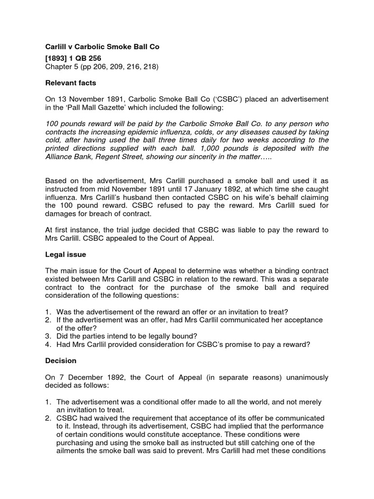 Was there a binding contract between the parties? Julie accepted and acted according to leila's advertisement. In calill v carbolic smoke ball(1893) constituted good consideration, because it was a distinct detriment… Carlill v carbolic smoke ball company (1893).written version. The 1892 case of carlill and the carbolic smoke ball company is an odd tale set against the backdrop of the swirling mists and fog of victorian london.