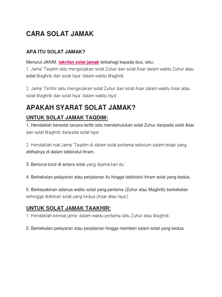 Berikut tata cara sholat dengan bacaan sholat lengkap. Misalnya dhuhur dan azar dijadikan satu, ditunaikan saat waktu dhuhur saja. Semisal kita sedang malas lalu menjamak sholat. Sholat jamak adalah sholat yang menggabungkan dua waktu sholat (sholat fardhu) dalam satu waktu sholat. Selalunya, di hentian r&r lebuh raya utara selatan (plus), kita biasa nampak tatacara, panduan dan cara solat jamak dan qasar di dinding surau.