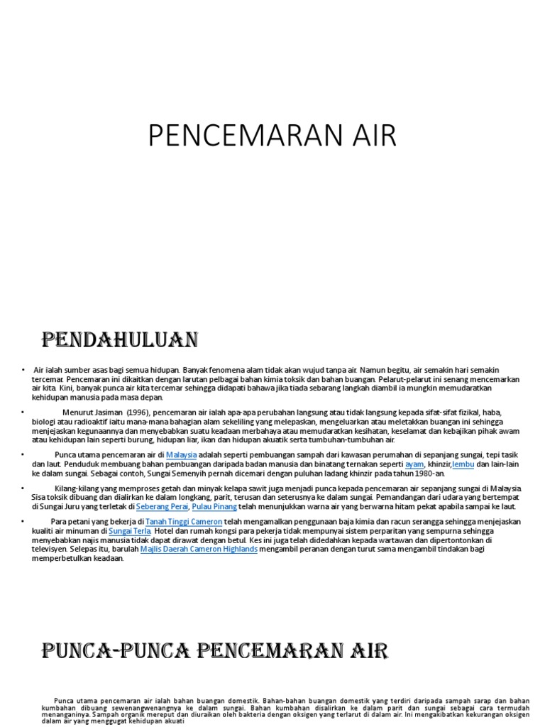 Terjadinya pencemaran air bisa terjadi di lingkungan sekitar kita. Pencemaran boleh dikategorikan kepada dua bahagian aiitu pencemaran punca bertitik dan punca pencemaran tidak bertitik ( moran et. Antaranya ialah pembuangan sampah yang tidak teratur ,najis, sisa perkilangan ,bahan pembangunan negara dirancang melalui dua rancangan utama , iaitu rancangan malaysia lima tahun dan rangka rancangan jangka panjang (rrjp). Antara punca pencemaran air di malaysia ada banyak. Pencemaran #guruipa pencemaran air adalah pencemaran badan air (seperti lautan, laut, danau, sungai, air tanah dan lainnya).