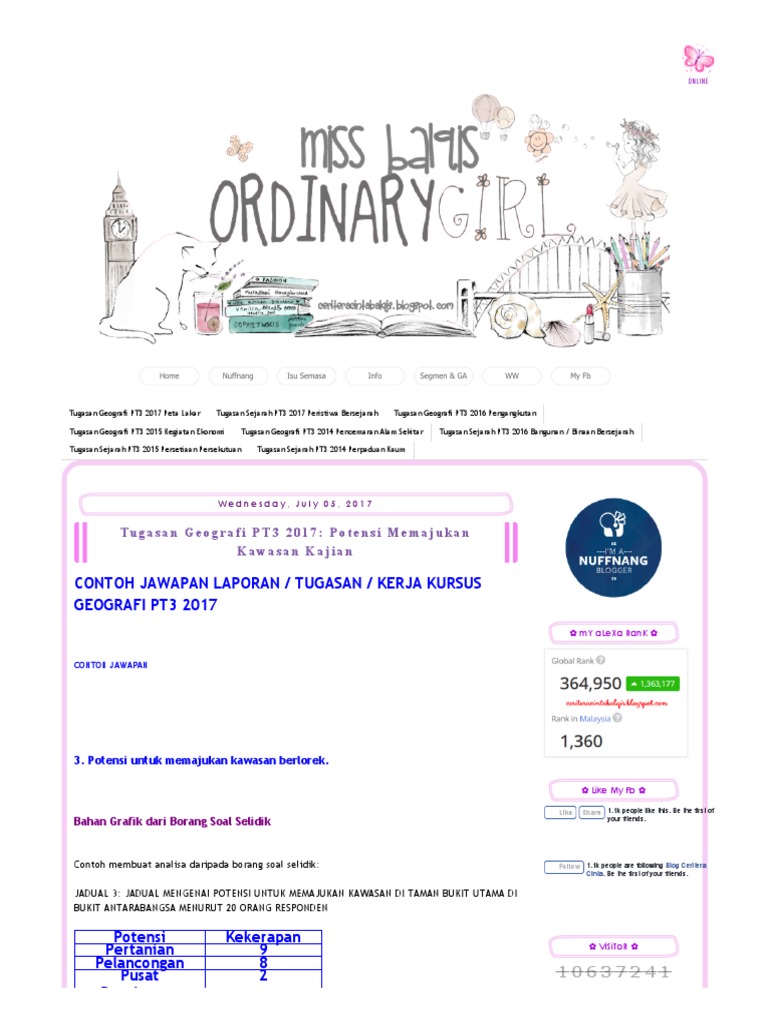 Majalah • nama majalah : Contoh membuat analisa daripada borang soal selidik. Menghuraikan halangan untuk memajukan kawasan berlorek 5. Tugasan geografi pt3 2017 potensi memajukan kawasan kajian. Jul 03, 2017 · tugasan pt3 geografi 2017 :